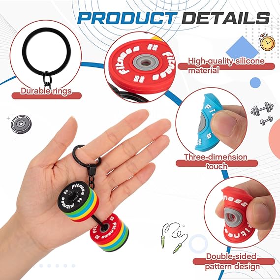 Proper Size: Our Barbell keychain has 5 diffident colors including red, yellow, black, green and blue. Each color has 2 silicone weight plates. Each plate is 3.5cm / 1.3 inches diameter, and thickness is about 0.4cm/ 0.15in.