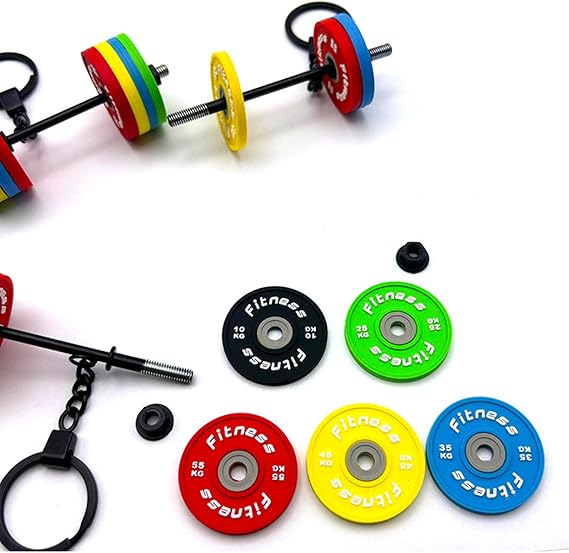 Funny Design: Our gym dumbbell weight keychain features an eye-catching and novel design. It has one metal barbell bar and silicone weight plate. You can assemble them easily into a complete barbell. Our barbell plates look like real. Different colors represent different weights.