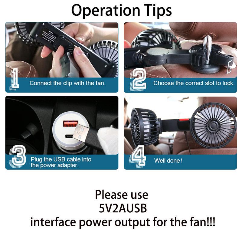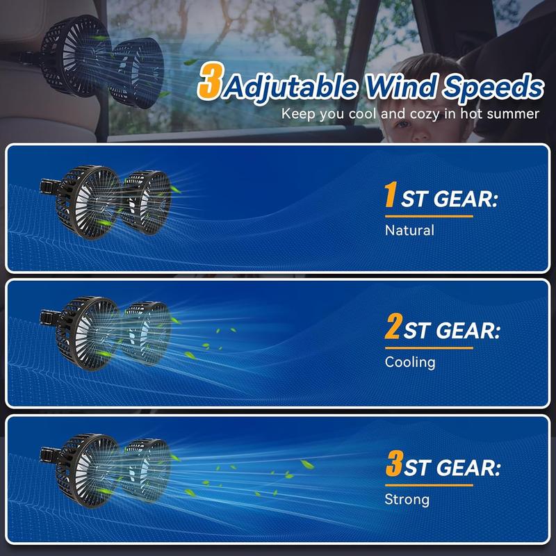 3 Speed Control: The rear seat car fan has 3 speed settings: low, medium and high, so you can adjust the airflow to your preference and weather conditions·Enhanced Air Flow: The fan for car takes up little space and can be angled as needed. Reduces fogging on the windshield, circulates stale air, eliminates heat, smoke, dust and pet odors, and ensures fresh and comfortable air inside the car