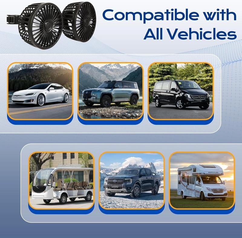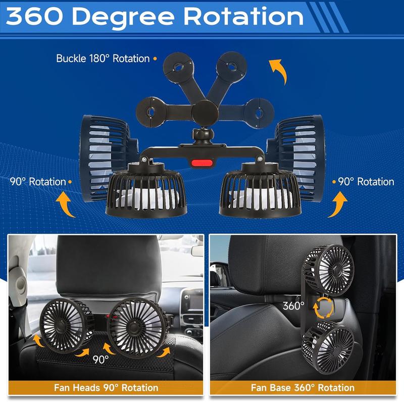 360 Degree Rotating Dual Head Design: The dual head car fan is fully rotatable, the fan head can rotate 90° and the fan base can be adjusted 360°