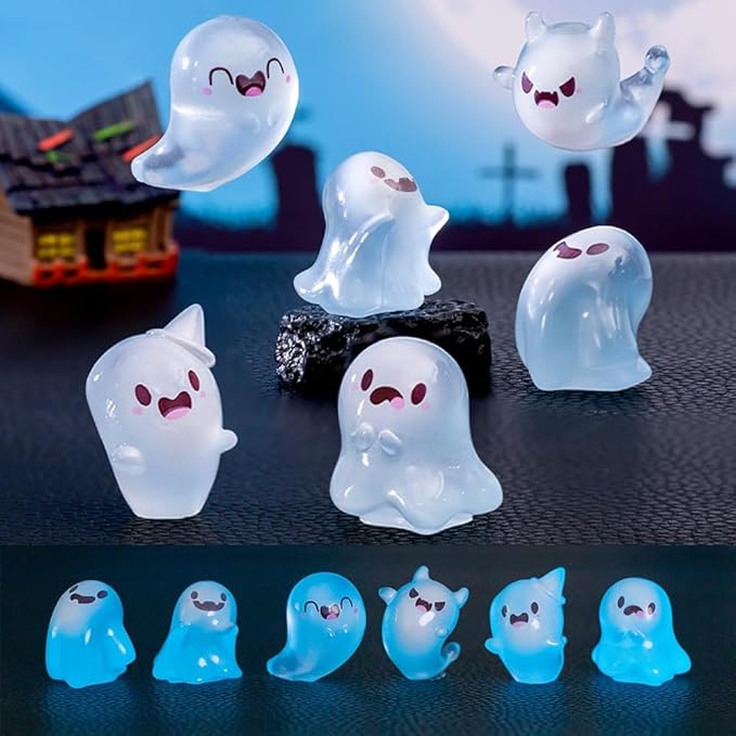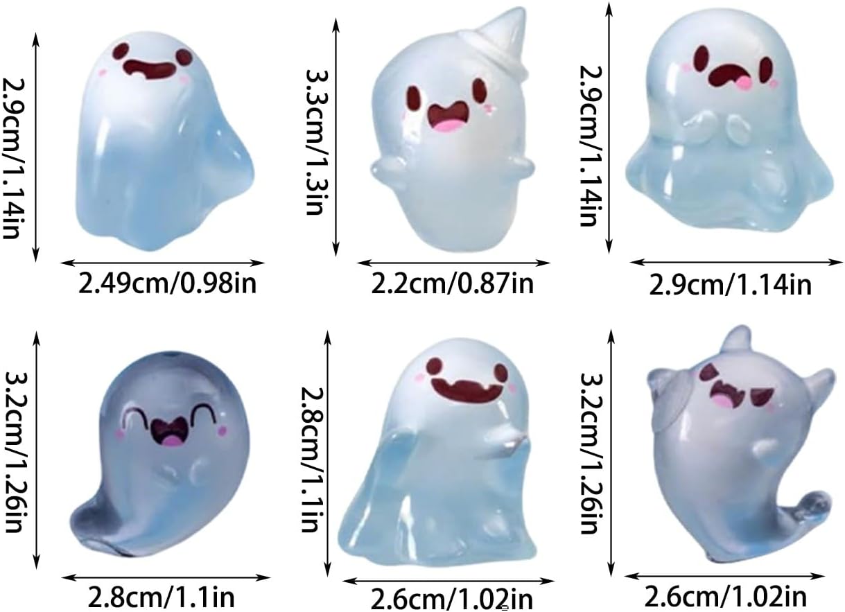 12 luminous ghost figurines in 6 designs(Floating Ghost, Smiling Ghost, Wandering Ghost , Little Devil Ghost, Slow Ghost, Top Hat Ghost )