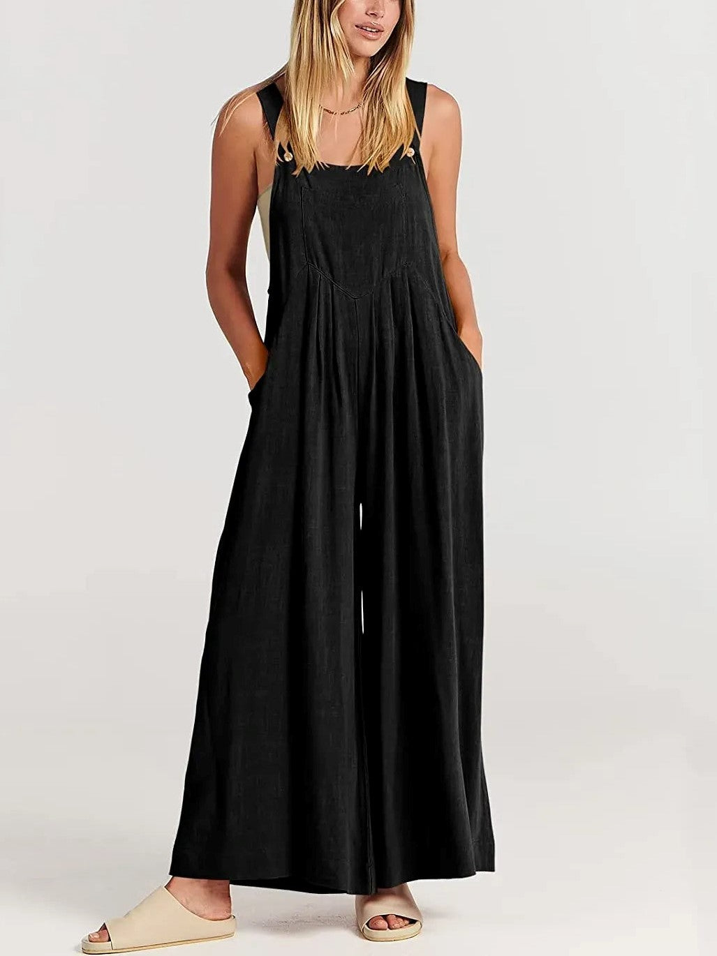 This overalls jumpsuit is designed with adjustable shoulder straps, button detailing, sleeveless style, square neckline, pockets, wide leg pants, is a loose casual fit.💕