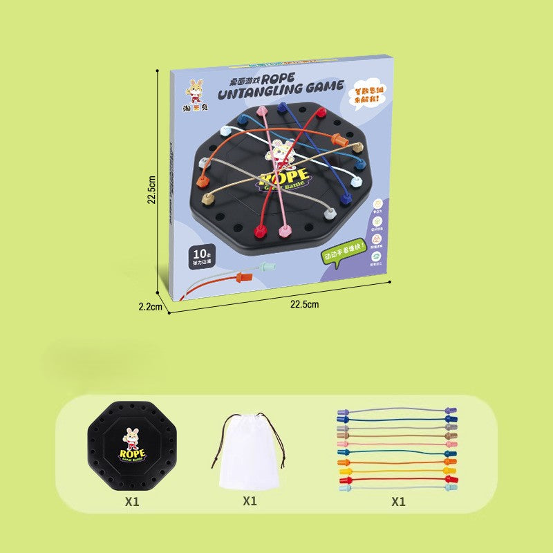 ćHow to Playć: "Insert both ends of 10 vibrant ropes (plastic-tipped) into the boardās 22 holes, twisting into knots or crosses. Adjust difficulty with 3-10 ropes! Players move rope tips OVER othersānever underāto empty holes. Remove untangled ropes and clear all to wināFor detailed instructions, watch the video: How to Play ā Rope Untangling Challenge."
