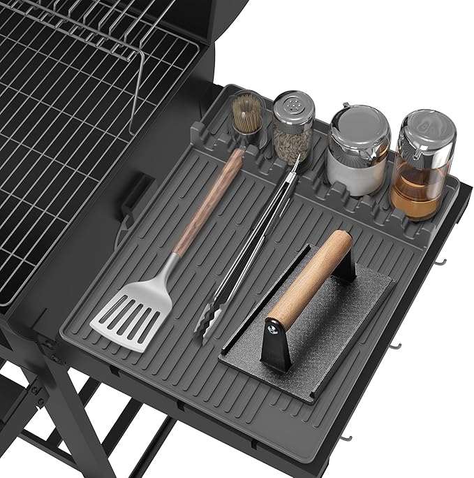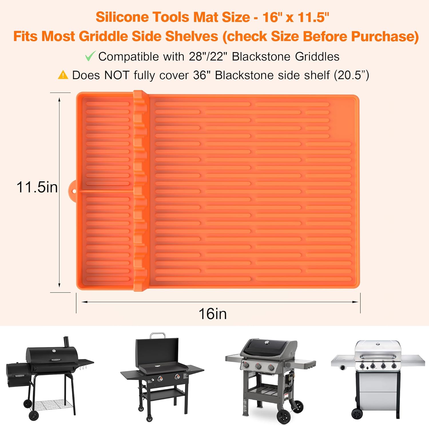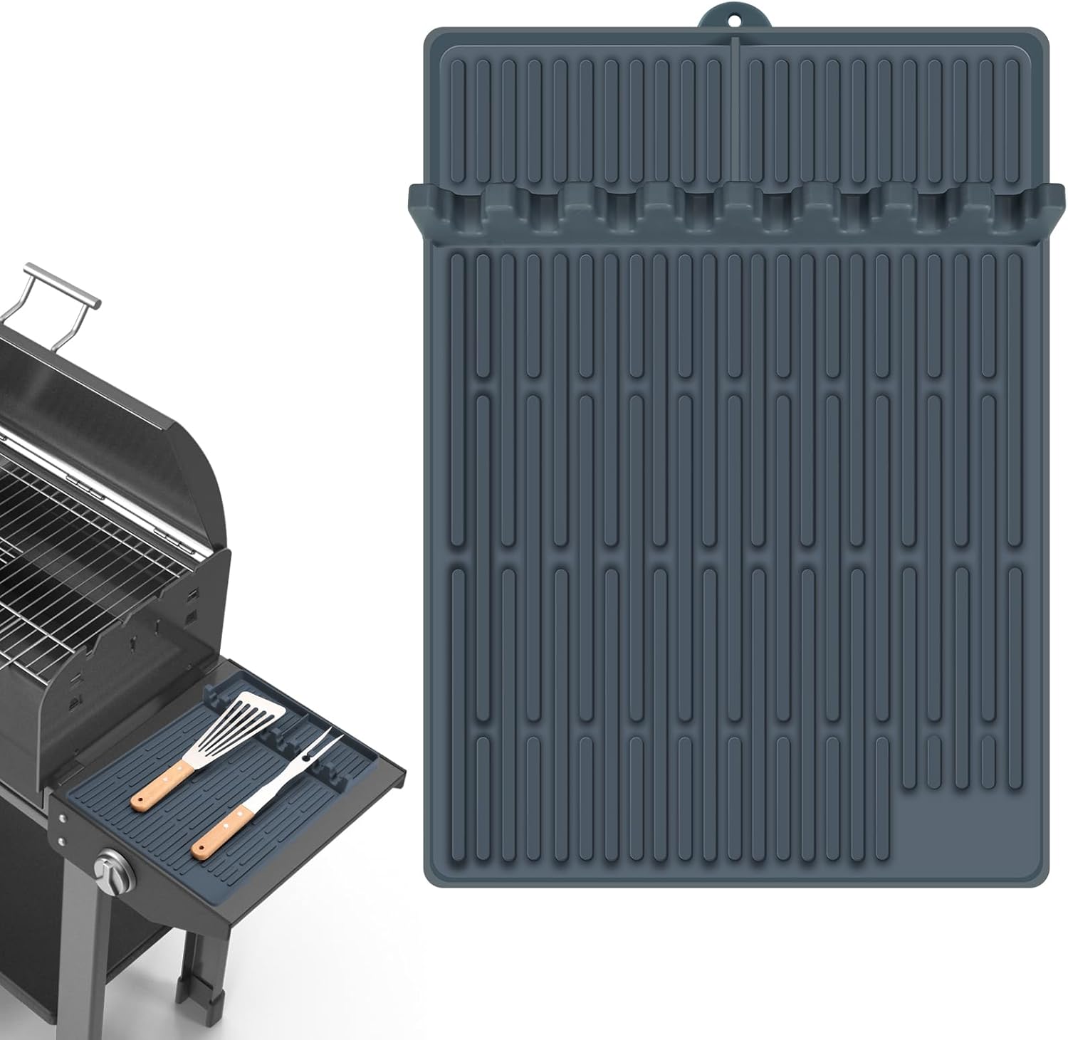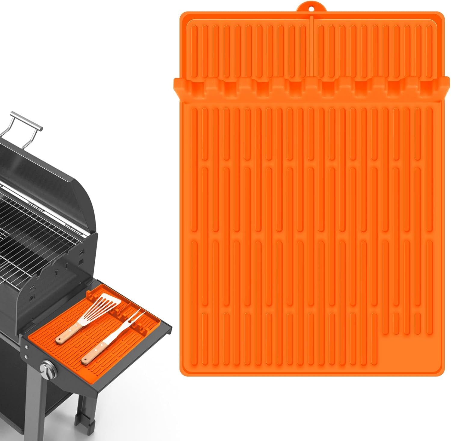 Designed to fit seamlessly beside grills, stovetops, or countertops, this mat provides ample space for utensils while maintaining a low-profile, space-saving design. Perfect for home kitchens, camping, BBQs, or RV cooking. -