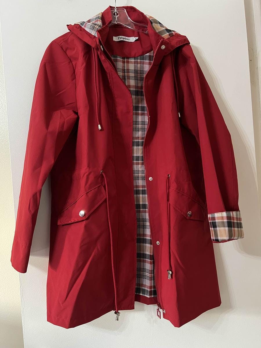 Really really nice rain jacket. Love that you can take off the hoodie. Like that the hoodie has extra room to protect the face. Good quality material. Fascinated with the color