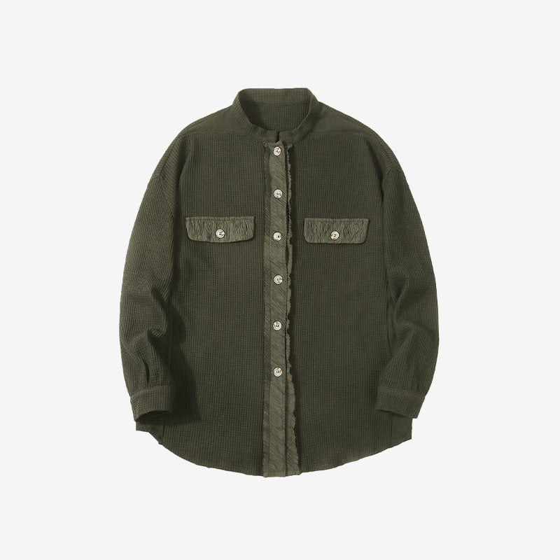 Waffle knit shacket jacket for women featuring slouchy batwing sleeve and distressed spliced design, front single breasted button up closure, chic stand collar, frayed raw hem with side split.
